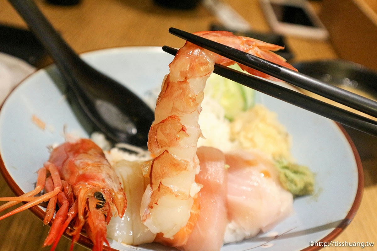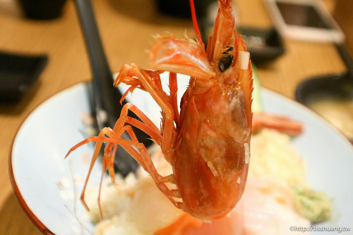 超澎湃的生魚片海鮮丼飯,有鮭魚卵、天使紅蝦、各種生魚片,光這一隻蝦子成本就100多了吧!