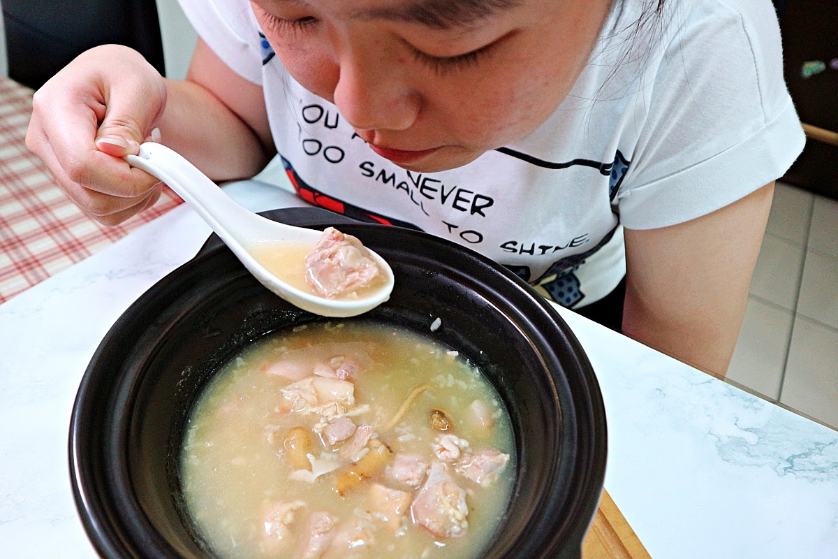 湯頭的人蔘味非常濃郁,入口的湯汁有如牛乳般的濕潤並且帶有清新糯米的香氣,雞肉、糯米都已經煮到入口即化,軟爛不柴,人蔘氣香郁,味甘甜,所以真的只要加熱就能馬上食用,對於家中牙齒不好的老人,真是一個福音。