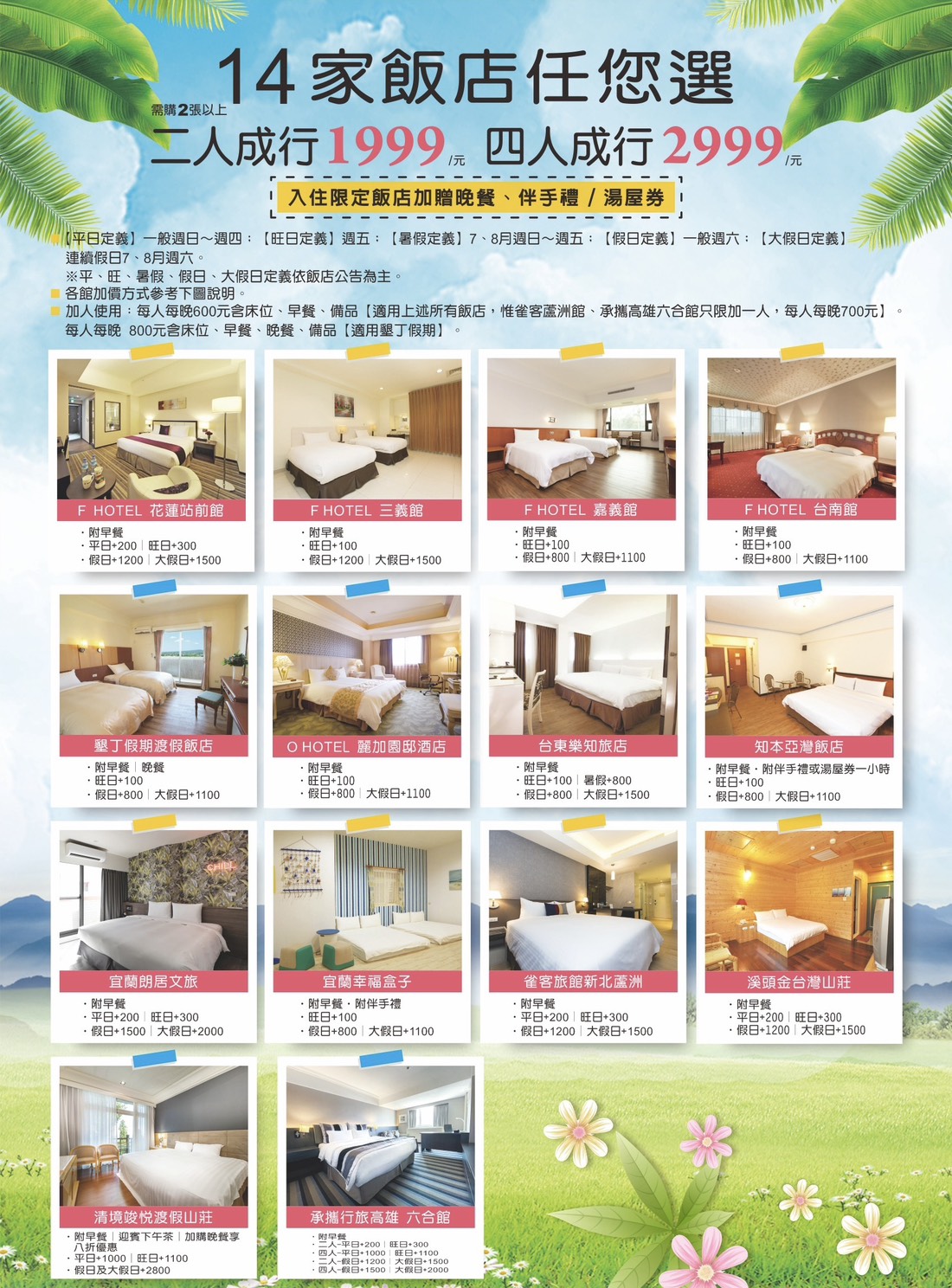 惟雀客新北蘆洲館、承攜行旅 高雄六合館(二人房+200/四人房+1000)、花蓮站前館、宜蘭朗居文旅、溪頭金台灣山莊週日到週四需加價$200元;旺日週五需加價$300元,清境竣悅渡假山莊週日到週四需加價$1000元;旺日週五需加價$1100元。⭐️F hotel連鎖飯店及系列飯店相關連結: