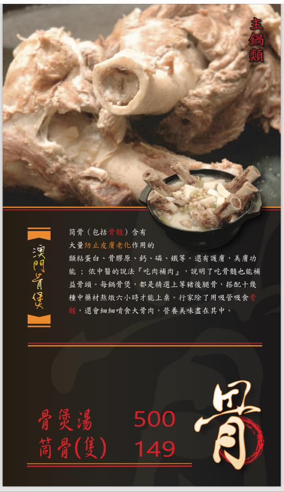 如果說沙蜆鍋是鮮甜代表、花雕雞鍋是香氣霸主,那麼澳門骨堡最具標誌性的招牌鍋品非 招牌骨煲鍋 莫屬。這道鍋幾乎是每桌客人必點,它不只是味道濃郁,更是一場 視覺、味覺與操作樂趣三重享受!