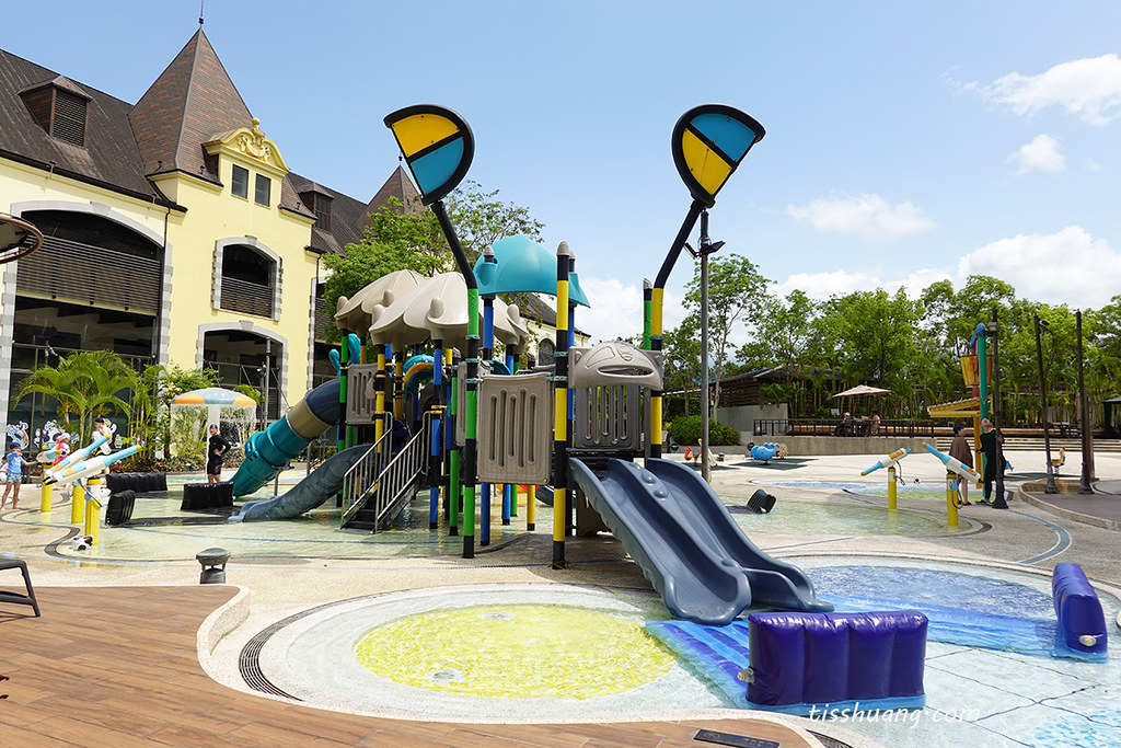 戶外戲水區:有滑水道、大水桶和小朋友專屬的淺水池,夏天這區可能要傍晚來比較不曬,我們4月份到訪,稍微有點涼涼的