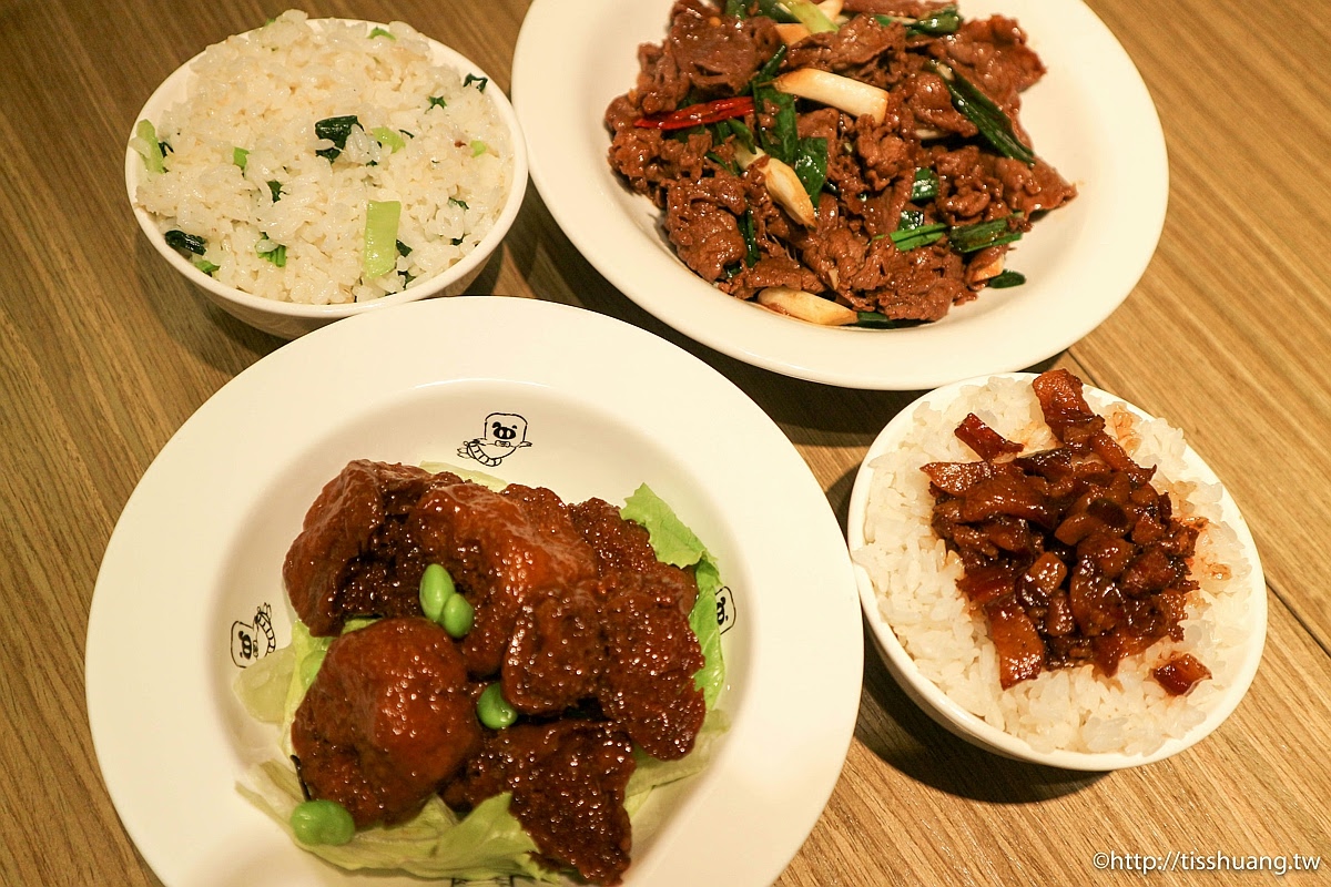 蔥爆牛肉(上)、上海菜飯(左)、魯肉飯(右)、烤麩(下),這個組合就讓我食指大動