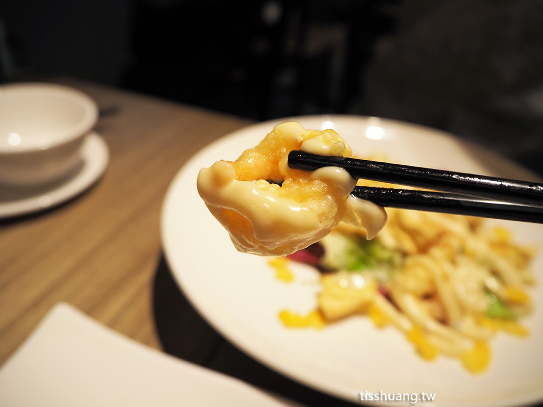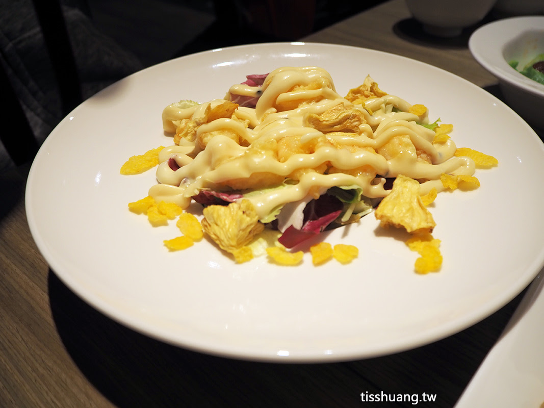這道菜的莎拉醬有酸酸甜甜的口感,並且有百香果的香氣,跟一般吃到的鳳梨蝦球比起來,我更愛偏酸偏甜的口感,因為鳳梨蝦球口感比較甜,吃多了也比會比較膩。