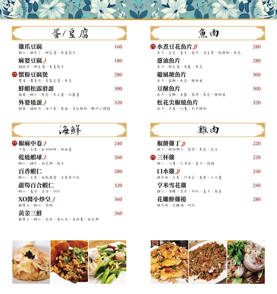 川味豆花(上)、椒麻中卷(下)、百香蝦仁(左)