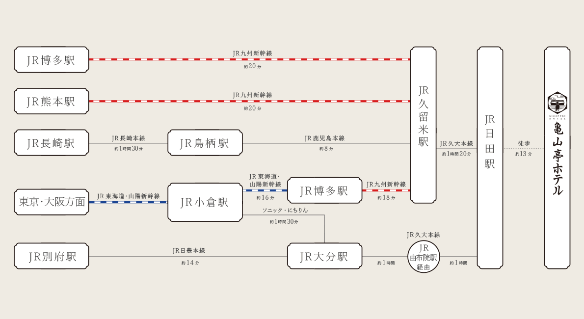 - 電車:從博多站搭乘JR久大本線至日田站,約90分鐘