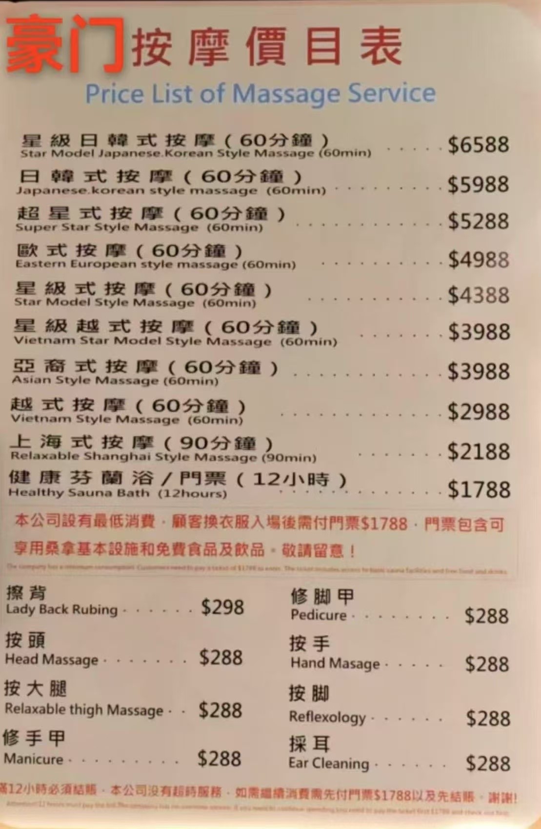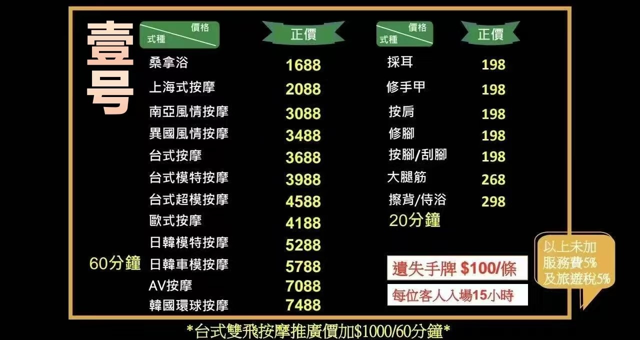 壹號桑拿的收費在大型場館中屬於正常水準,另外還需加收 10% 的服務費。透過預約,還可以免費獲得兩次 20 分鐘的師傅按摩服務,並享有現金折扣。目前依然是澳門最多人選擇的桑拿場所,口碑相當不錯。唯一需要注意的是,晚上前往可能需要排隊,但絕對值得等待!