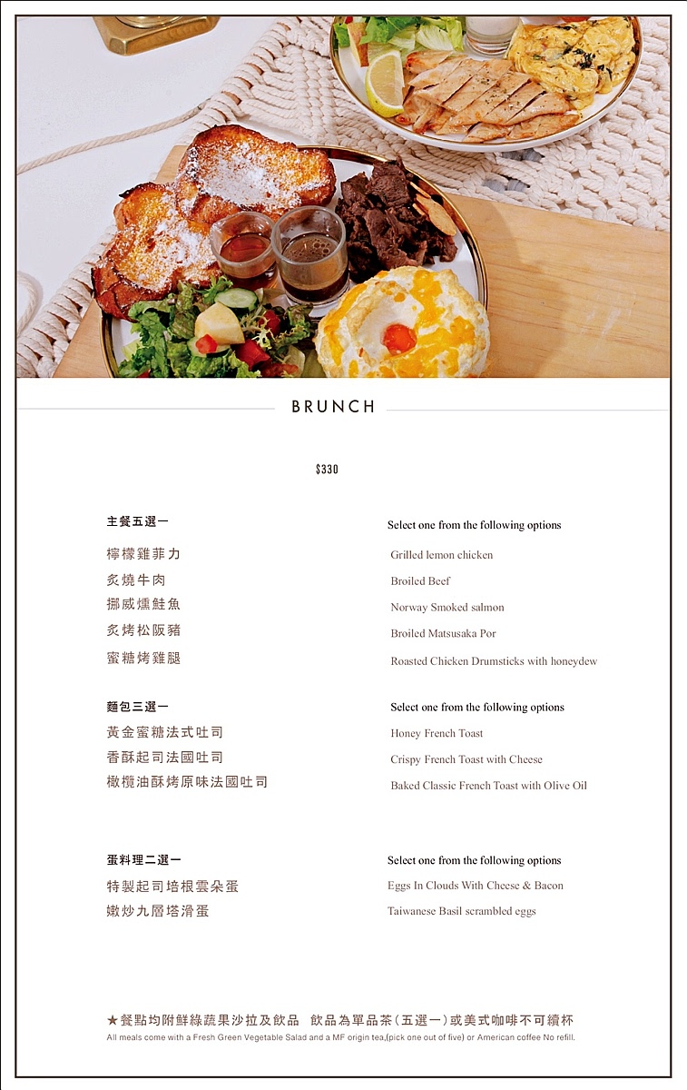 我們今天點的餐點有Brunch 套餐$330(炙燒松阪豬、橄欖油酥烤原味法國吐司、特製起司培根雲朵蛋),墨西哥雞肉辣椒$280、和風牛肉沙拉$250、芝士滿滿奶蓋紅茶、旺來QQ冰茶