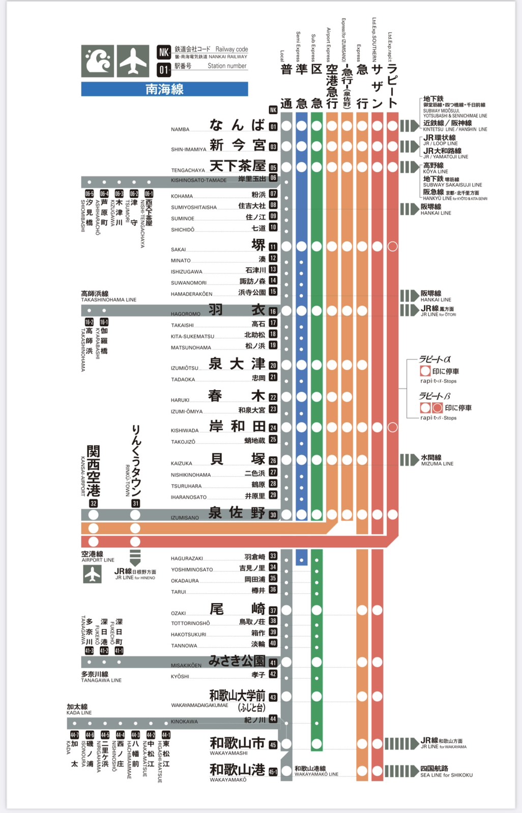 - 特色:快速舒適,座位寬敞,全車指定席,直達大阪難波站附近。