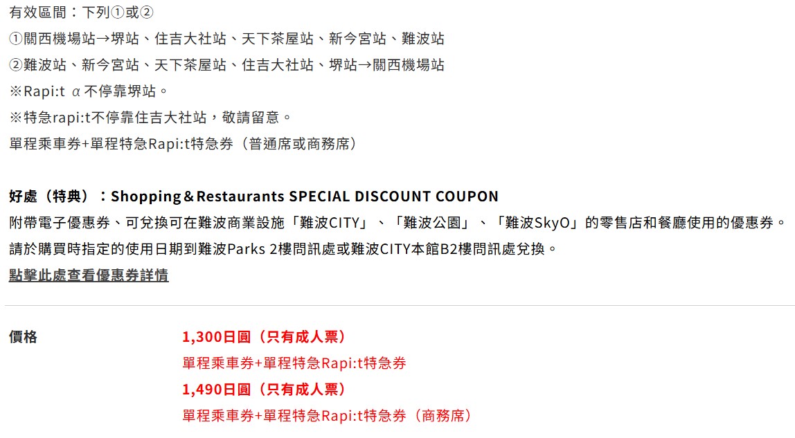價格:一般車廂是$1300日幣,台幣約$289,商務車廂是$1490日幣,台幣是$328,線上購買都只有成人票,0-5歲不佔車位不需購票,6-11歲需現場購票。👉南海電鐵機場至難波站車票