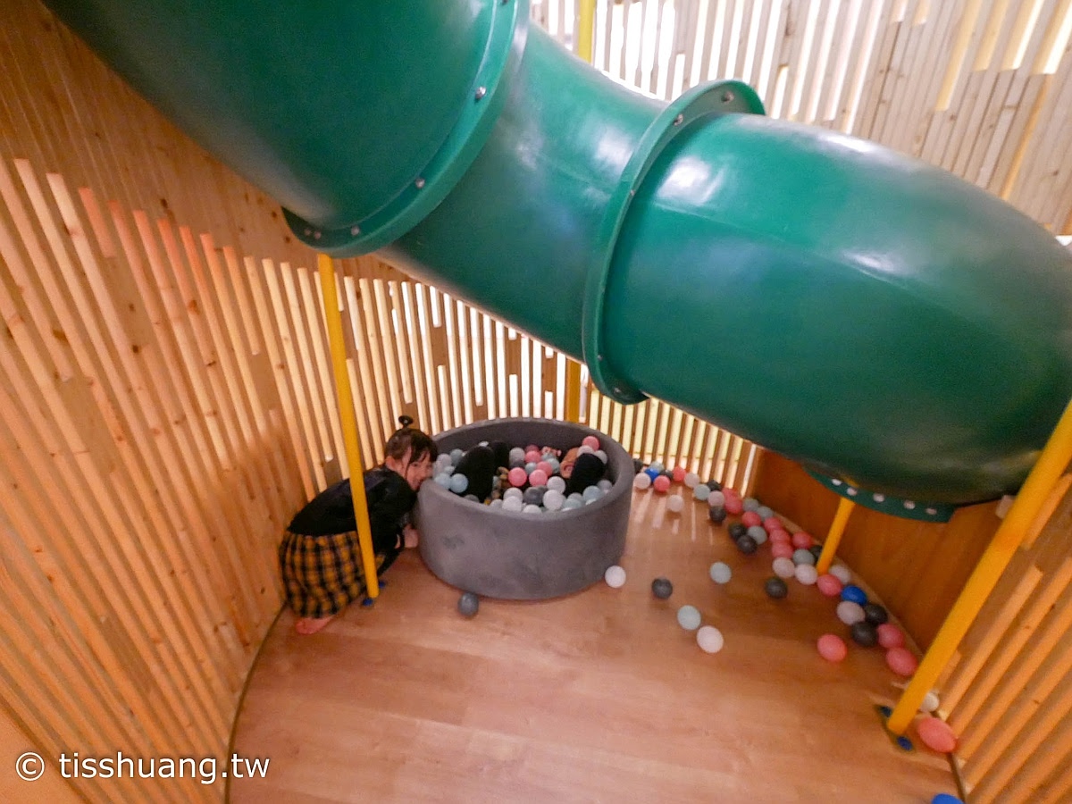 兩層樓的旋轉溜滑梯,讓小孩玩得不亦樂乎,還有小小的球池