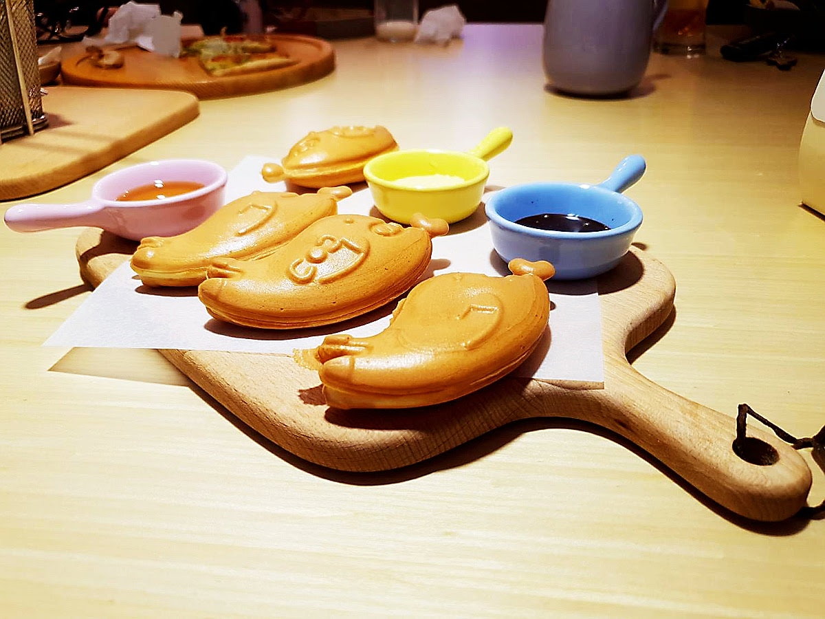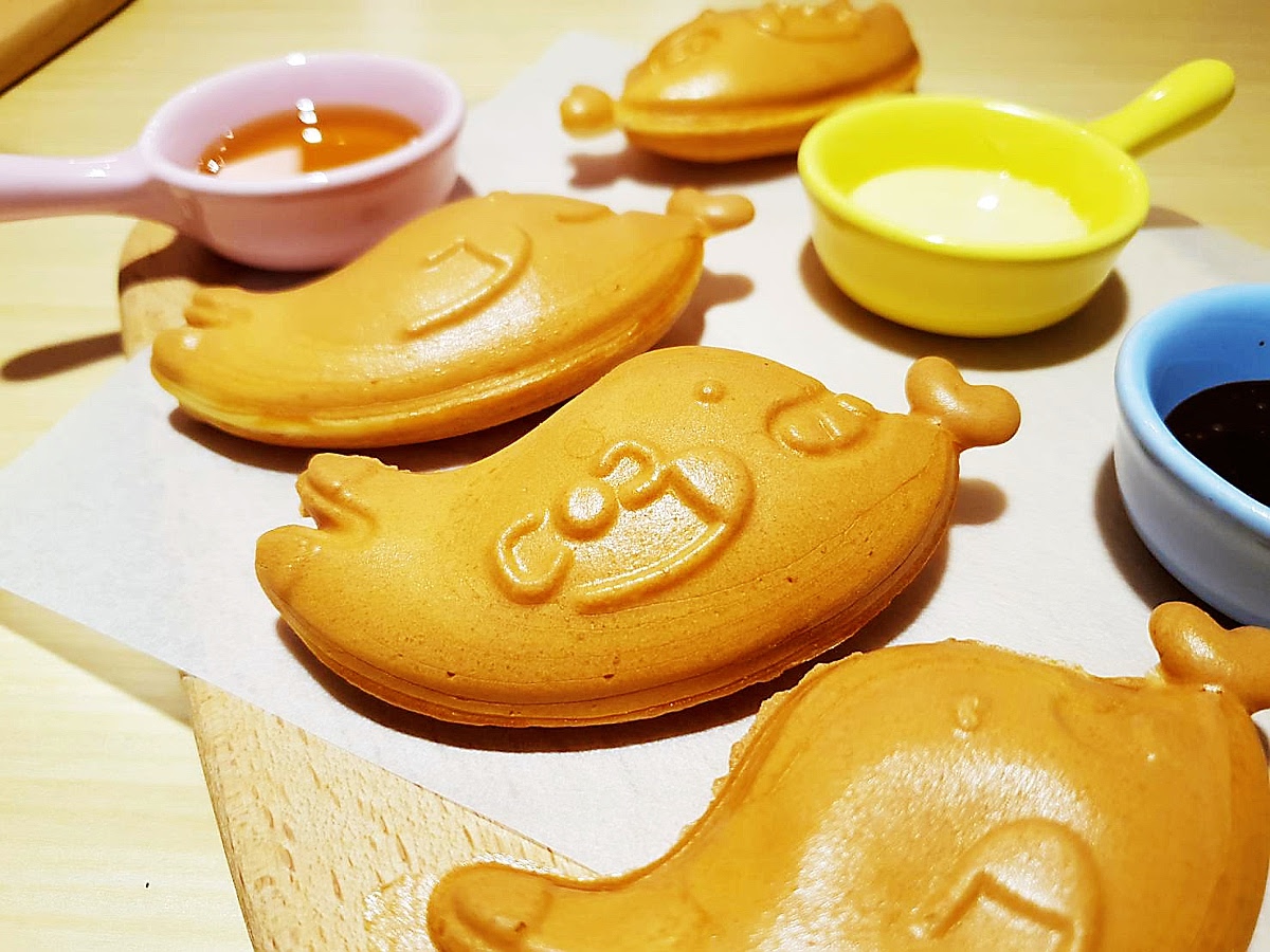這造型可愛又好吃的雞蛋糕,根本一上桌就秒殺,雖然有很多沾醬可以搭配,有蜂蜜、煉乳、巧克力醬,但是不沾醬就超好吃了