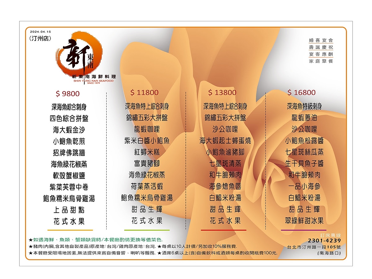 如果只是吃一般海鮮快炒,個人是不建議吃這家,畢竟現在海鮮快炒店很多..應該都有新鮮的水準..不過,同事和老爸都吃過這家的「辦桌菜」,都說很棒呢!看來是適合大宴不適合小酌…新東南海鮮餐廳桌菜價錢如下