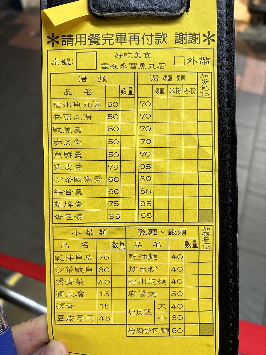 永富魚丸店菜單選擇蠻多樣的,除了招牌魚丸之外,還有魷魚羹、赤肉羹、魚酥羹,滷肉飯、乾麵、炒米粉等等